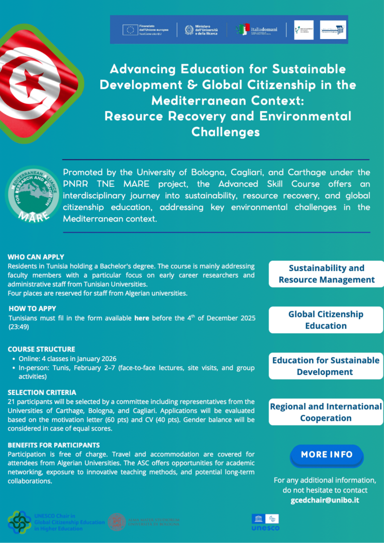 As part of the PNRR TNE MARE project (Mediterranean Alliances for Research and Education), funded by the Italian Ministry of University and Research (MUR), the University of Carthage / ISCE is selecting 20 candidates to participate in an Advanced Skills Course (ASC):
