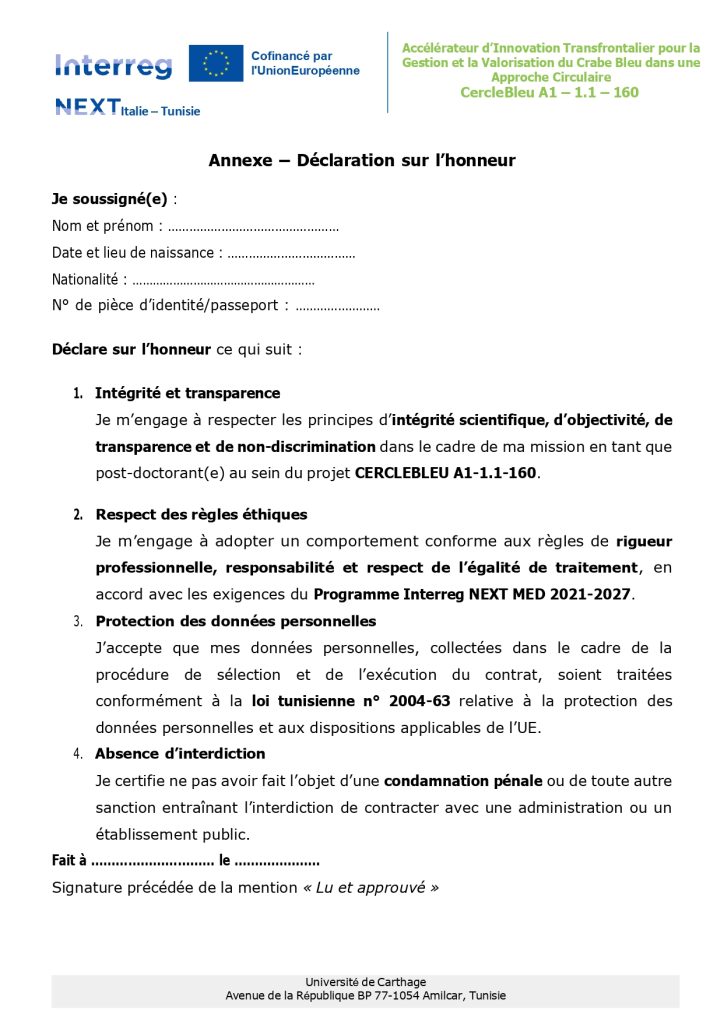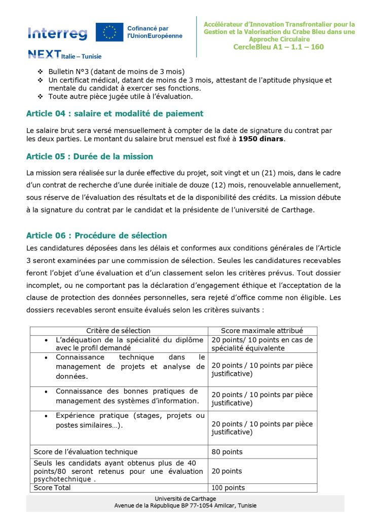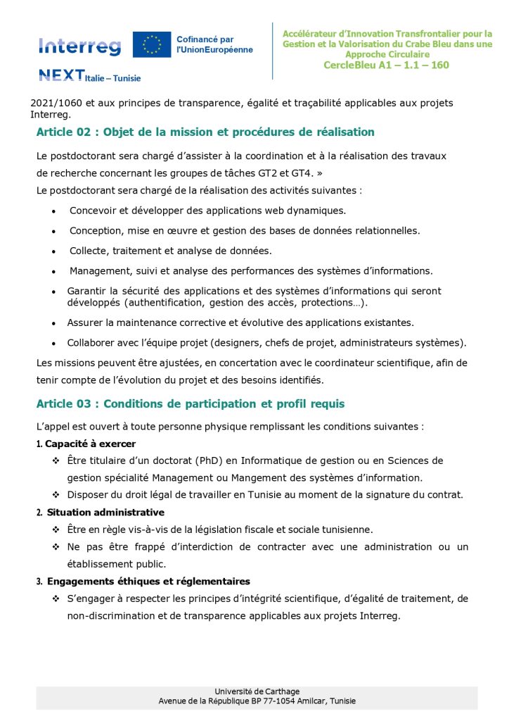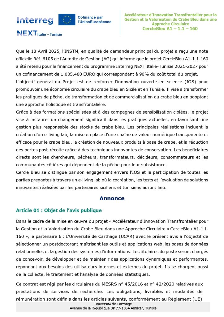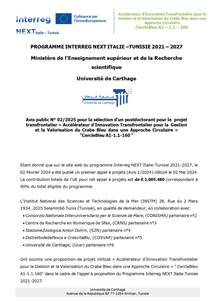 Public Notice No. 02/2025 for the selection of a Postdoctoral Researcher for the cross-border project“Cross-Border Innovation Accelerator for the Management and Valorization of the Blue Crab within a Circular Economy Approach